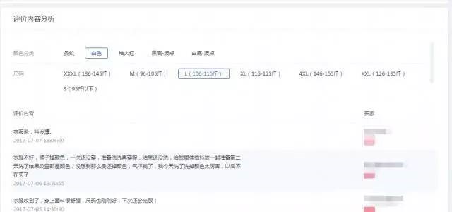 評(píng)價(jià)內(nèi)容分析也是一個(gè)非常重要的指標(biāo),從這里你可以看到每一個(gè)顏色、每一個(gè)尺碼的買家評(píng)語(yǔ)。