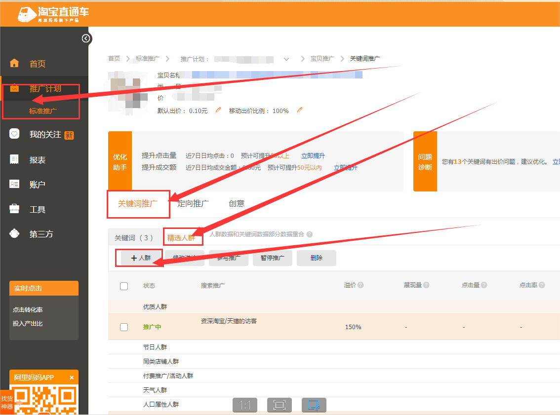 2.關(guān)鍵詞推廣下面精選人群,添加人群。添加訪(fǎng)客人群,選擇人口屬性人群,根據(jù)上面自己生意參謀的訪(fǎng)客分析來(lái)設(shè)置類(lèi)目比單價(jià),性別,年齡和月均消費(fèi)額度。調(diào)整溢價(jià),保留30%利潤(rùn)自己調(diào)整相應(yīng)的溢價(jià)。