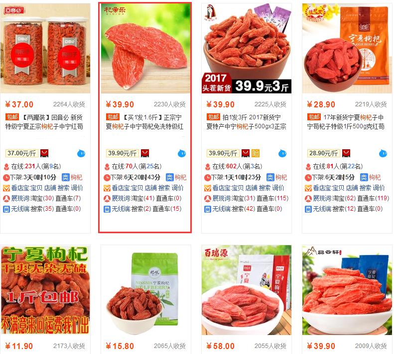 那接下來我再舉個例子:去搜索一下枸杞這個產(chǎn)品,基本都是右下角這樣的風(fēng)格的主圖,那么買家都是會走馬觀花的去瀏覽網(wǎng)頁。而這個時候,是不是如圖下的紅色框的主圖比較有創(chuàng)意一點呢?先不說是否有美感,起碼可以在第一時間抓住買家的眼球,從而大家可以看待,這個店鋪的銷量也是很不錯的。