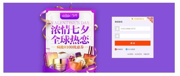 如圖5淘寶的登陸頁面海報,則是以浪漫神秘的紫色系為主要搭配顏色,配以紫色漸變的文字,絲帶等元素制作的。