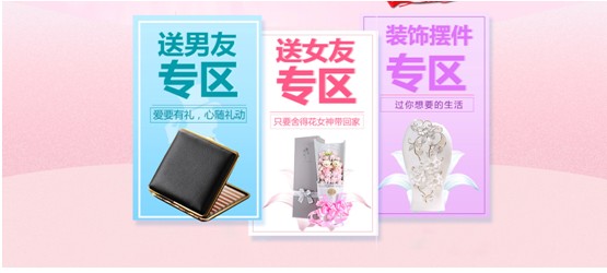 如圖10將活動分為了送男友專區(qū)、送女友專區(qū)和裝飾擺件專區(qū),很清晰的例舉出了不同的專區(qū),方便客戶對想要的產(chǎn)品進(jìn)行選擇購買。可以說很貼心的考慮到了客戶的購買心理。