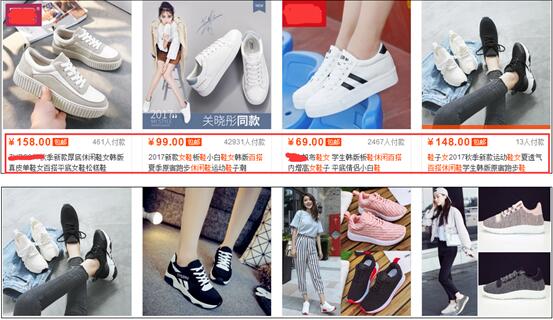 “休閑鞋”和“運(yùn)動鞋”,尤其是女款,很多的寶貝標(biāo)題中,都會同時有這兩個關(guān)鍵詞,但是大家同時去搜索一下這兩個詞:休閑鞋女 小白鞋、運(yùn)動鞋女 小白鞋,你會發(fā)現(xiàn)出現(xiàn)的搜索結(jié)果頁面,重復(fù)的商品非常非常的少。