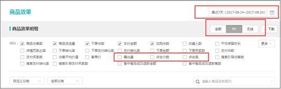 打開你的生意參謀——商品——商品效果——最近7天的數(shù)據(jù),然后看PC端的數(shù)據(jù)(當(dāng)然,你會告訴我,現(xiàn)在誰還看PC端的數(shù)據(jù),都看無線端了好不好,但是你要注意,目前生意參謀無法把曝光量、點(diǎn)擊次數(shù)這些數(shù)據(jù)表現(xiàn)出來,并且從整體效果上來看,你探查的是點(diǎn)擊率,這是有一定的代表性的)