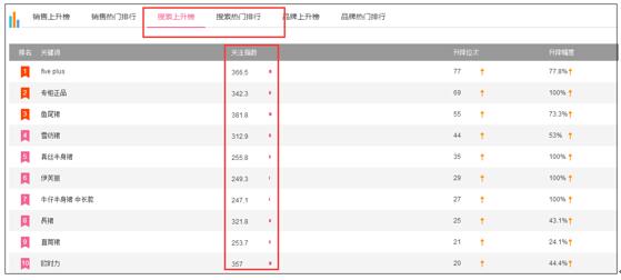 關(guān)于如何去判斷哪個修飾詞會比較好,這里給大家提供一個小思路(其實有生意參謀,應(yīng)該用生意參謀的標準版,但是如果你是新開店或者小微創(chuàng)業(yè)者,可能就沒有),你可以用淘寶排行榜(top.taobao.com),然后看一下你準備做的類目的“搜索上升榜”和“搜索熱門排行”: