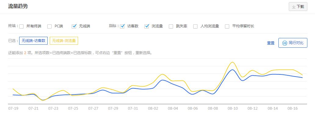 首先我們打開(kāi)生意參謀,然后在流量面板里面的流量概況可以看到一個(gè)流量趨勢(shì),而在流量趨勢(shì)面板里面我們可以看到無(wú)線端的一個(gè)瀏覽量和訪客數(shù)上升和下滑的趨勢(shì),然后我們可以根據(jù)這個(gè)上升和下滑的趨勢(shì),并注意是什么時(shí)候下滑的。