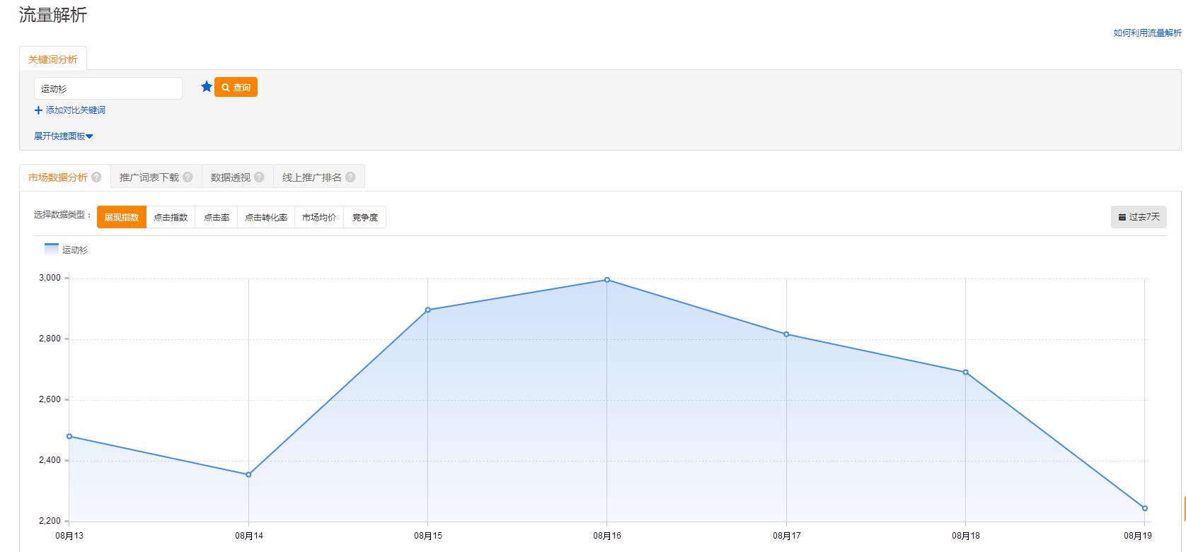 在這里我并沒(méi)有馬上說(shuō)去維護(hù),因?yàn)槲覀冃枰催@個(gè)詞在行業(yè)里面是否發(fā)生下滑了。這樣就好去判斷需不需要維護(hù)。比如說(shuō)運(yùn)動(dòng)衫這個(gè)時(shí)下滑了,我們就可以去通過(guò)生意參謀里的市場(chǎng)行情,去看是否有出現(xiàn)搜索人氣降低。如果沒(méi)有生意參謀的商家們也不要緊,我們還可以用直通車的流量解析去查看這個(gè)詞的展現(xiàn)情況是什么樣的。