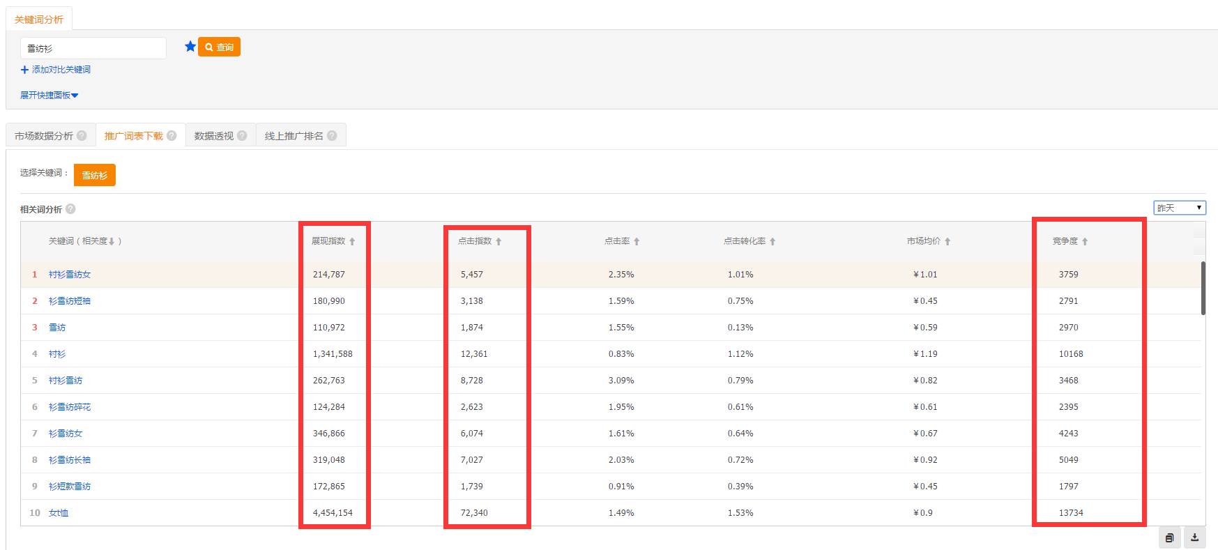 天貓代運(yùn)營進(jìn)入直通車流量解析界面。輸入我們的核心詞,選擇推廣詞表下載,參考展現(xiàn)指數(shù),點(diǎn)擊指數(shù)和競爭度。展現(xiàn)指數(shù),點(diǎn)擊指數(shù)即為市場需求,競爭度就是市場競爭。