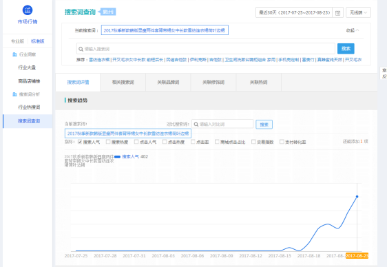 進(jìn)入生意參謀,在市場行情里搜索詞查詢,將你的核心詞輸入在搜索欄的進(jìn)行搜索,會顯示非常多和你核心詞相關(guān)的其他詞,我們可以留下符合我們寶貝屬性的長尾詞,然后參考他的商城點(diǎn)擊占比,在線商品數(shù),搜索人氣來尋找一些需求高,競爭低的長尾詞。(2)Pc端下拉框