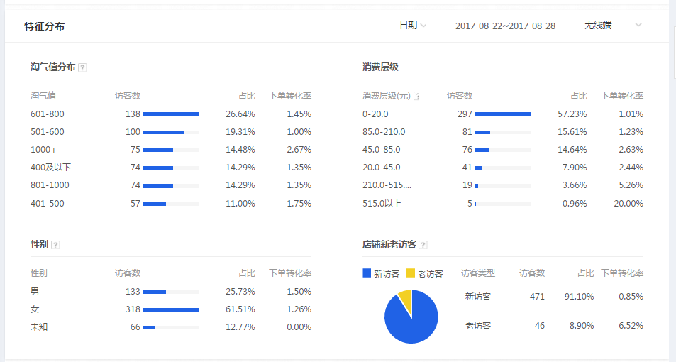 根據(jù)上圖,我們可以做出一個(gè)簡(jiǎn)單的分析,0-20元的人群轉(zhuǎn)化率才1.01%,他的消費(fèi)能力很弱,這部分人群占了總流量的57%,另外人群呢是45元以上人群,轉(zhuǎn)化比較好。大家可以看出來(lái),在這個(gè)店鋪可以說(shuō)是消費(fèi)層級(jí)越高的人,轉(zhuǎn)化率也會(huì)越高。店鋪低客單流量這么多可以說(shuō)是因?yàn)榍捌谝鳑](méi)注意客單方面,導(dǎo)致人群標(biāo)簽沒(méi)打好,那么我們可以通過(guò)關(guān)聯(lián)營(yíng)銷來(lái)增加客單價(jià),使店鋪人群定位往高客單人群發(fā)展。