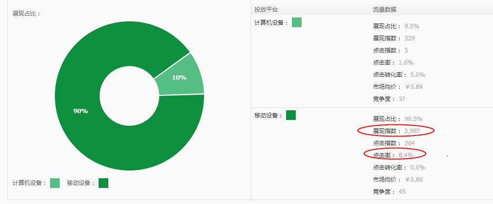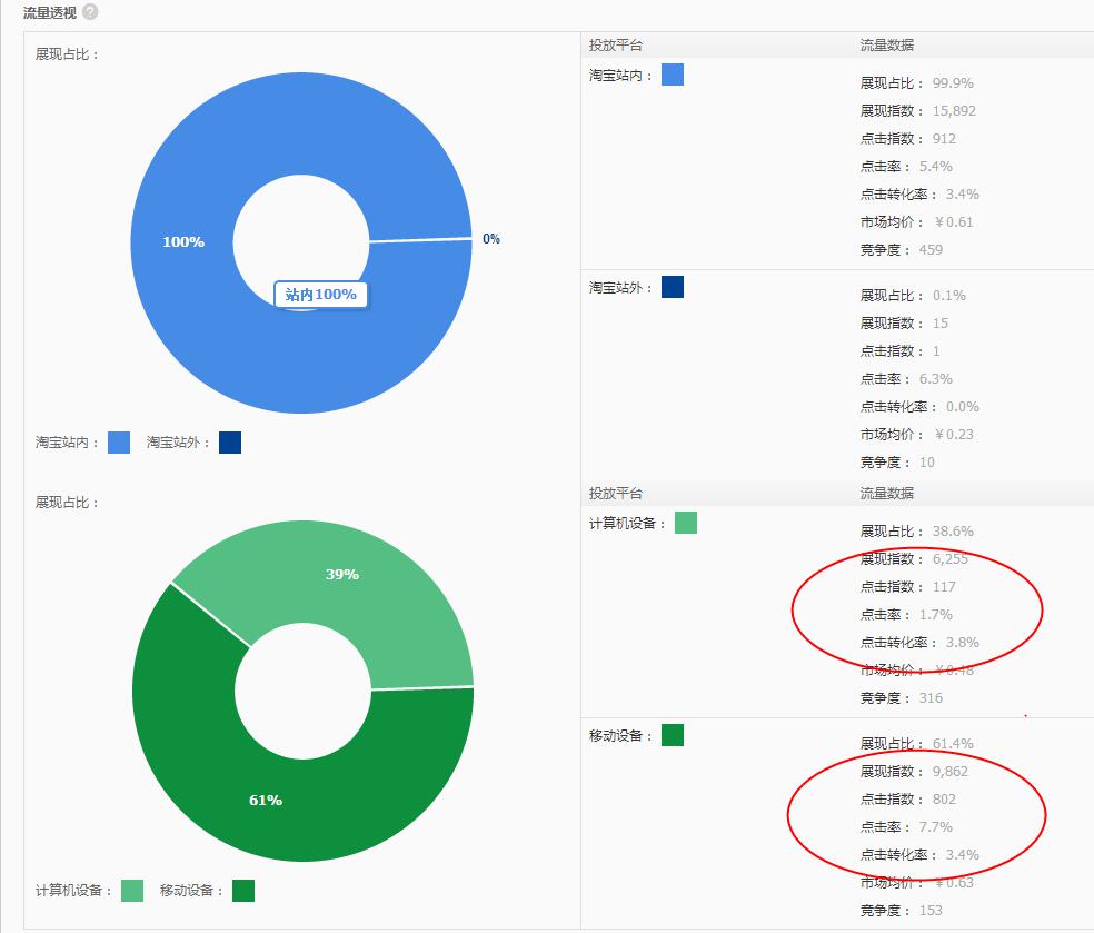 在我們關(guān)鍵詞的流量解析中就能看到,點擊關(guān)鍵詞之后,我們就能夠看到,在這個頁面中,這個關(guān)鍵詞計算機端展現(xiàn)指數(shù)有多少?在這里可以看到,這個關(guān)鍵詞的pc端的展現(xiàn)指數(shù)是6255,移動端展現(xiàn)指數(shù)是9862,而點擊率pc端就是1.7%,移動端點擊率7.7%,而這些,就是關(guān)鍵詞的行業(yè)數(shù)據(jù)水平。Pc端的轉(zhuǎn)化率水平是3.8%,移動端轉(zhuǎn)化率水平是3.4%。