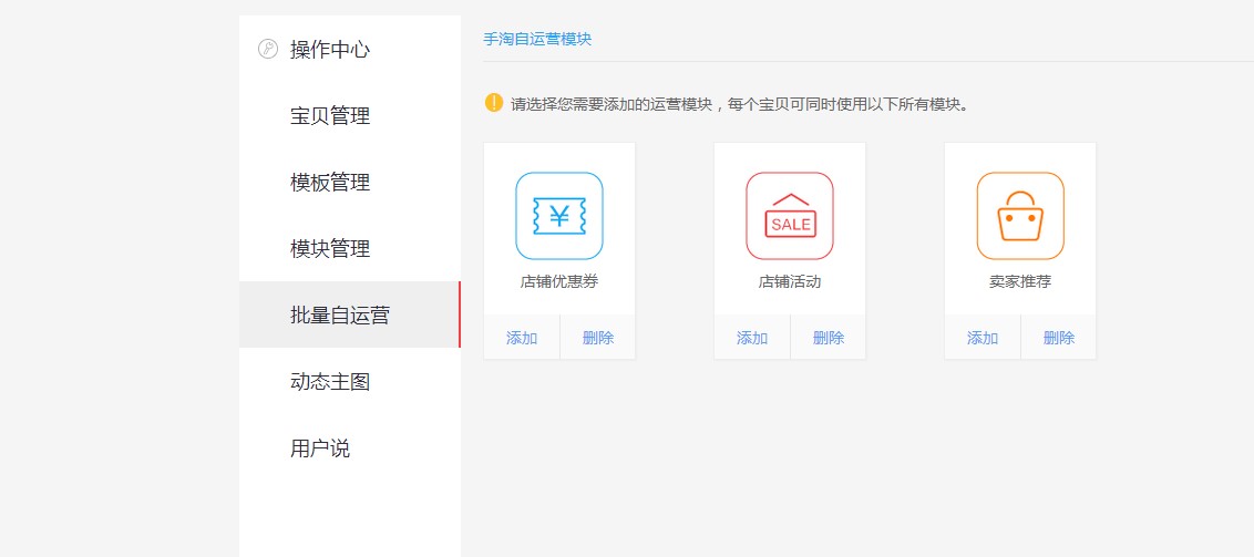 打開你店鋪的無線運(yùn)營中心的頁面,進(jìn)入詳情裝修,在右上角有一個(gè)模板管理,打開后我們可以看到有三個(gè)模塊,優(yōu)惠券,店鋪活動(dòng)和寶貝推薦。如下圖所示,