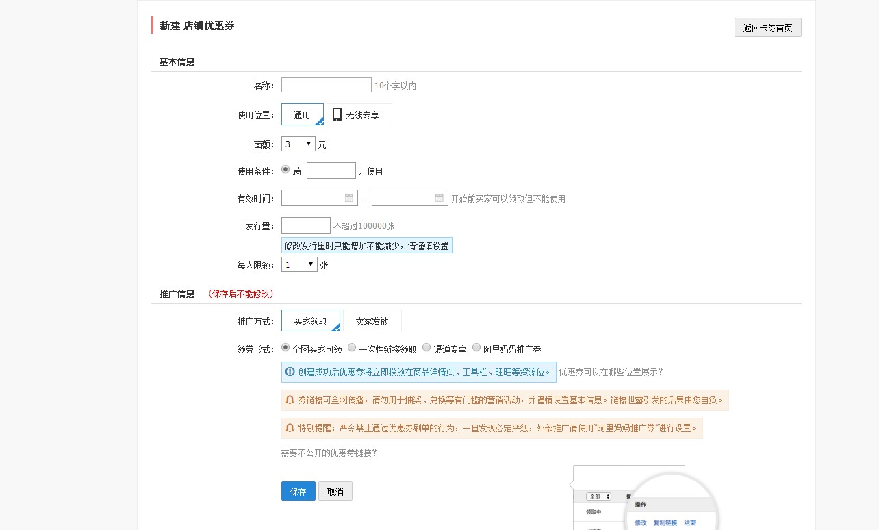 先點(diǎn)擊添加,添加的是我們之前已經(jīng)設(shè)置好了的優(yōu)惠券模塊,如果之前我們沒有設(shè)置,那么在這里也可以設(shè)置,點(diǎn)擊添加優(yōu)惠券,立即創(chuàng)建,之后就如下圖所示,