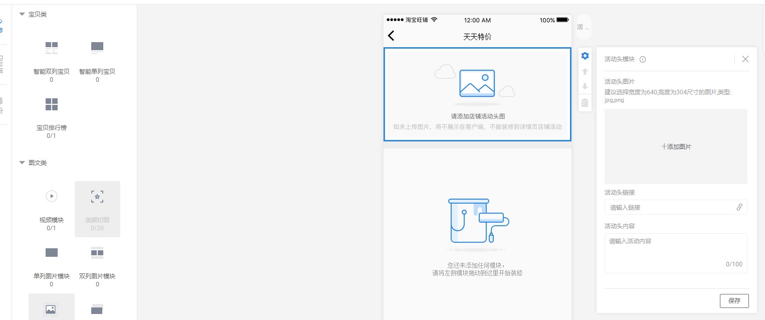 點(diǎn)擊活動(dòng)頁面的板塊,需要上傳一個(gè)活動(dòng)的圖片,那么這個(gè)圖片是展示在詳情頁里面的,所以圖片的清晰度以及尺寸都要提前把控好。下面是添加活動(dòng)圖片的鏈接,添加得鏈接可以是寶貝的鏈接,也可以是分類鏈接。再下面就是一個(gè)文本的內(nèi)容,因?yàn)槟闶亲龌顒?dòng)的模塊,所以文本的編輯也要獨(dú)特和吸引人。讓買家有想去點(diǎn)擊進(jìn)去的欲望。最后保存發(fā)布就可以了。這就是活動(dòng)模塊。
