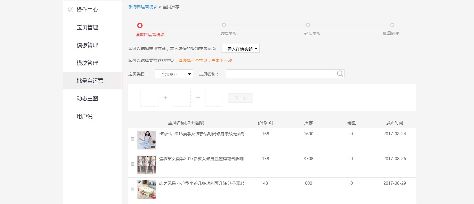 點(diǎn)擊添加,選擇置入詳情頭部,選擇你想推薦的三款寶貝,下一步之后選擇你想把這三款寶貝推薦到的寶貝詳情頁里。這樣的話,在別的寶貝的詳情頁里就可以看到賣家推薦的這三款寶貝了。如下圖所示,