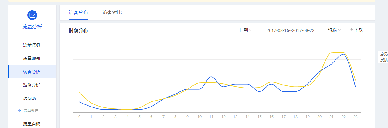 這里面關(guān)鍵是時間點(diǎn)的選擇打開生意參謀在“經(jīng)營分析”模塊,看一下“訪客分析”里面的第一個時間段分析: