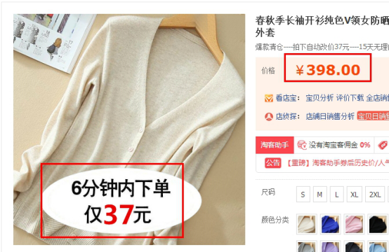 第一個(gè)例子,售價(jià)398,但是主圖文案寫:6分鐘內(nèi)下單僅37元,你有想單價(jià)的沖動(dòng)嗎?寫上了這句話,傳達(dá)給買家的就是我現(xiàn)在在大促,你現(xiàn)在6分鐘內(nèi)下單就可以花37元拿走398元的針織衫。抓住了買家喜歡貪便宜的心理,而且主題明確。我的目的就是要買家點(diǎn)擊并且下單。你需要去想的是你的目標(biāo)客戶需要什么,他們需要的是占便宜。這個(gè)案例大家可以借鑒。
