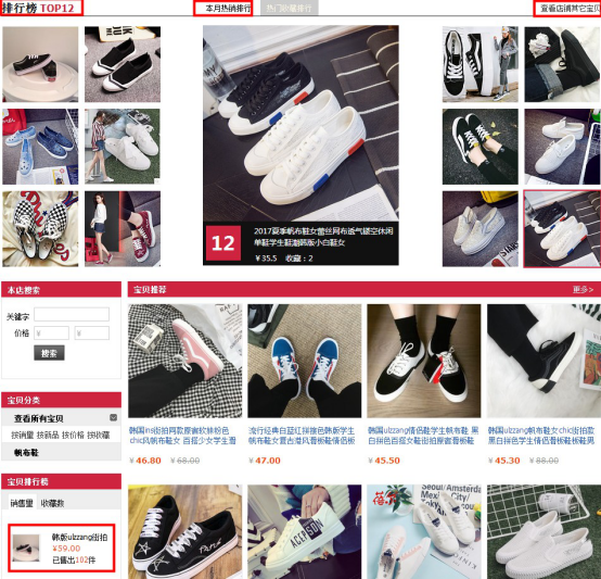 愛心店這4個(gè)席位之中另外一個(gè),300位排在93位。不能算是特色店,但其店鋪的整體布局規(guī)整、分類明確,用戶進(jìn)店選擇時(shí)不會(huì)出現(xiàn)選擇困難的感覺。而店鋪的定位很精準(zhǔn)——情侶板鞋,這樣既可以單賣男款,又可以單賣女款,又可以賣情侶雙款,且款式也有較多的選擇,寶貝外觀也符合情侶鞋的設(shè)計(jì)——就是學(xué)院風(fēng)
