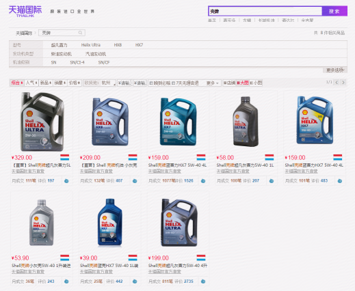 目前在天貓國際上搜索“殼牌”字樣,依舊還有多位商家公開售賣殼牌的潤滑油產(chǎn)品,且月銷量不菲。而對比同樣5W-40的“1升裝全合成機油”,天貓國際與天貓旗艦店的價位分別是53.9和150元,兩者價位懸殊巨大,間接導(dǎo)致天貓殼牌官方旗艦店的月銷售額受到?jīng)_擊影響。