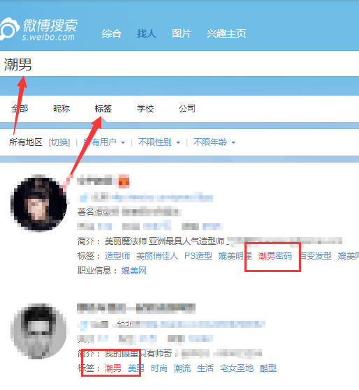 微博,微型博客,微博的月活躍用戶量有4億,在微博里面有大量的大V,這些大V都有自己的粉絲,每一個微博粉絲都會有自己擅長的方面。微博搜索找人,例如你做潮男的商品,那么我就去搜索潮男,下面選標(biāo)簽是潮男,如下圖。找微博達人注重幾點一個是粉絲量,和你要推廣的標(biāo)簽是不是一樣。像阿里V任務(wù)的那些達人,基本也有其他站外的自媒體,他們可能是微博達人也可能是其他自媒體的達人,這樣子我們可以和這些淘寶達人進行站外的合作。合作的目的想必大家很清楚,就是為了讓商品和活動頁面有更多的曝光量,在他產(chǎn)生興趣的時候會關(guān)注店鋪,加購店鋪寶貝以及領(lǐng)取雙十一優(yōu)惠券。
