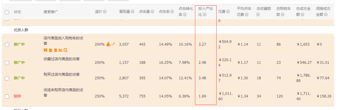第四步:在這個時候我們需要開始測試人群,因為人群會是之后帶來產(chǎn)出的主要來源,所以必須要測試精準(zhǔn),每個款的人群都不一樣,可以借鑒,但不能全部套用。這里就是建議所有的人群都最好單個打開,不要在測試階段就嘗試組合人群。這里是建議優(yōu)質(zhì)人群里后面四個人群,以及自定義人群里面的所有單個人群,都建出來,進行測試。測試人群是一個需要長時間段的事情,我們看數(shù)據(jù)一定要根據(jù)近7 天或者14天的數(shù)據(jù),在一個時間段的情況下,看點擊率,不太好的先暫停然后進行記錄,以免后續(xù)重復(fù)使用。