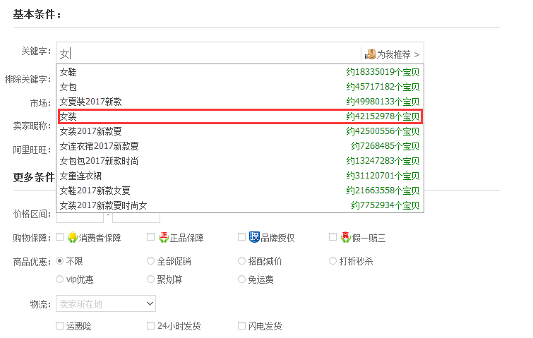 首先我要來給大家說的是,女裝沒有一款產(chǎn)品是可以來滿足所有買家的需求的,而個體的差異化,會對統(tǒng)一類目產(chǎn)生不一樣的需求。舉個例子,如果你是賣女裝的。然后我們點開淘寶的高級搜索,我們就可以看到現(xiàn)在的女裝寶貝有400多萬