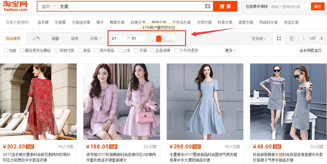 這里我還是用女裝為例子,篩選后的價格帶是這樣:10%的買家喜愛0—21元的;41%的買家喜愛21—91元的;36%的買家喜愛91—205元的;8%的買家喜愛205—365元的;5%的買家喜愛365元以上的。這個就是官方系統(tǒng)給出來的一個數(shù)據(jù),搜索關(guān)鍵詞后,首頁就會顯示的。而你屬于哪個區(qū)間的價格就去進(jìn)行篩選一下價格帶,這樣就可以幫你篩選掉很多的競爭對手了。
