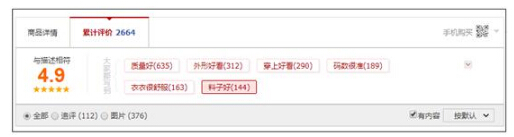 當(dāng)然啊,我只是截圖,人家的評論中是料子好。如果這里面“大家都寫到”(你可以認(rèn)為這里是評價標(biāo)簽)有灰色的,并且跟你在評論中觀察到的接近,都顯示面料不好。那么你在你的詳情頁當(dāng)中就可以重點突出你的寶貝面料好(當(dāng)然,前提是你的寶貝真的得面料好)。
