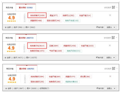 消費者關(guān)注什么,你就去切入什么。那么從哪里知道消費者購買一個商品時,關(guān)注的焦點呢?思路跟上面一樣,還是看消費者的累計評價詳情。我們舉一個例子,比如說狗糧:
