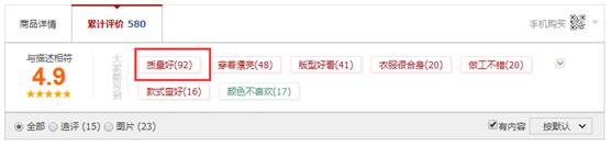 比如這款寶貝,是一款30多塊錢的連衣裙,你可以看到,消費(fèi)者關(guān)注的焦點(diǎn)集中在:版型、是否好看上面,也就是前面說(shuō)的會(huì)關(guān)注款式,關(guān)注啥,你就應(yīng)該在詳情頁(yè)當(dāng)中去凸顯啥。再看下面這個(gè):