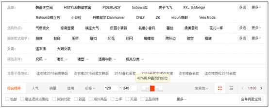 價(jià)格肯定會影響點(diǎn)擊率,這個(gè)首先我告訴大家,沒有一個(gè)明確的標(biāo)準(zhǔn),下面測試出來的這些數(shù)據(jù)所建立的測試店鋪基數(shù)也并不是特別大,所以僅供參考。我們拿“連衣裙 2018新款”這個(gè)關(guān)鍵詞舉例: