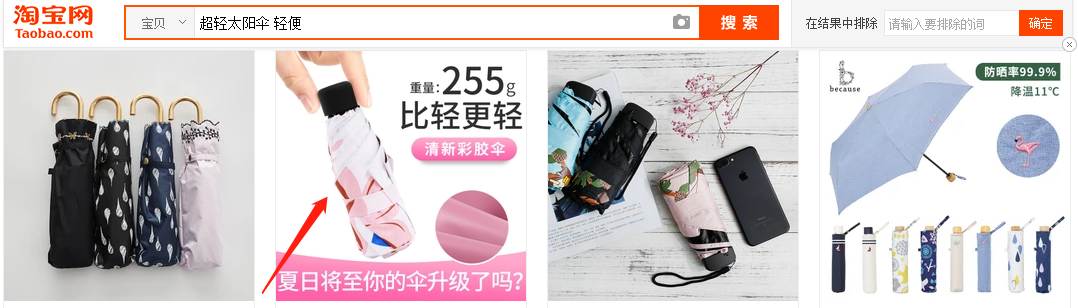 買家對于我們寶貝的第一印象是來自于我們的主圖,因此主圖并不是越美觀越大氣越好,而是要與你的主關(guān)鍵詞(也就是進店大流量詞)相一致。買家的搜索關(guān)鍵詞,就意味著他在尋找什么,那么我們要是在主圖上表達出買家正需要尋找的東西,直擊買家的痛點,圖片點擊率是不是會很高。比如說買家想要的是“超輕太陽傘 輕便”,那么你的主圖是不是就可以突出他的重量,以及方便,才能讓買家點擊瀏覽并促成購買?