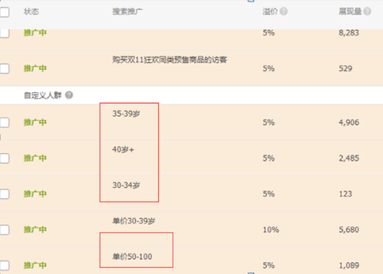 直通車在投放初期,大家也都不知道哪些人群轉(zhuǎn)化是比較好的,所以在預(yù)算可控的情況下,建議可以多測試一些人群。初期不知道要投放什么人群時,可以參考生意參謀后臺數(shù)據(jù),看看我們店鋪近7天、近30天哪些訪客人群是比較多的、支付轉(zhuǎn)化率較好的人群是在哪個階段,一般對瀏覽過收藏過的人群可以相應(yīng)的加大溢價,因?yàn)檫@部分人群算是店鋪的潛客了;對于自定義人群,我們也可以根據(jù)預(yù)算做細(xì)化的投放測試,比如下面這家女裝店鋪,生參數(shù)據(jù)顯示我們是在31-50歲的支付買家數(shù)中居多并且消費(fèi)層級是在35-60之間,那我們就可以相應(yīng)地對這些人群做測試投放了。