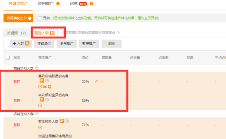 既然能夠新增這些欄目,就代表著欄目的需求性也展現(xiàn)也都是會有一定的機會。所以每一次的直通車改版,我們都要快速的去熟知,然后去玩透,如果店鋪不適合做,就嘗試后放棄。但是連嘗試都不敢的話,我相信想要發(fā)展都不會是一件容易的事情。在于直通車精選人群這塊,溢價是最容易得到人群標簽的定位了。再者就是嘗試定向,定向的話主要還是圈定人群原本的習(xí)慣,所以只要點擊率能夠維持的話,人群標簽形成也是有一定的作用。