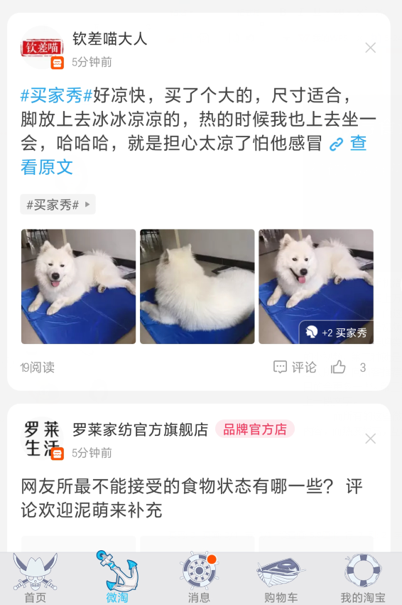 我們打開手機(jī)淘寶,在下方從左往右數(shù)的第二個(gè)就是微淘。我們點(diǎn)擊就能進(jìn)入微淘,進(jìn)入微淘之后,在上方有很多板塊,分別是關(guān)注、上新、推薦、美食、美搭、母嬰、數(shù)碼等等。而這每一個(gè)版塊都有很多不同的微淘內(nèi)容。這些微淘內(nèi)容,大體上來說,分為3種,一種是視頻類型,這一類型通常都是教程類,教你一些生活小竅門,教你怎么穿搭好看,或者是導(dǎo)購類,這種就是展示產(chǎn)品為主,也有一些是大片類的廣告,或者類似抖音的小視頻。第二種就是圖文類的,這一類往往是話題或者導(dǎo)購或則資訊類的,這個(gè)一般是由達(dá)人所寫,向顧客推薦好用的X款產(chǎn)品,或者搜羅各國美味泡面等等一類的,美妝和美食類目的會(huì)更多一些。第三種就是產(chǎn)品類的,這一類一般是九宮格圖片產(chǎn)品展示圖或者買家秀配上一段文字。