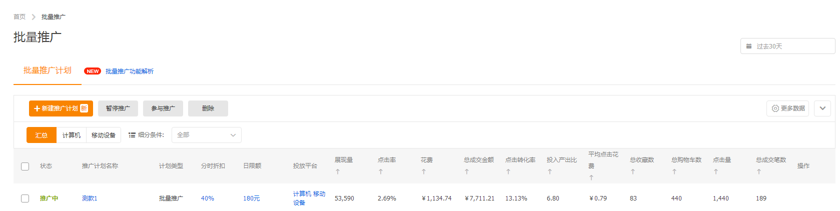 4、設(shè)置完之后,價格由系統(tǒng)自動出價,出價策略可以選擇測款和平銷。以下是最近30天的操作數(shù)據(jù)。