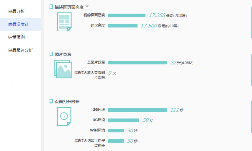 如上圖所示商品無(wú)線詳情最近7天平均停留時(shí)間30秒,這個(gè)算合格的。但是詳情的打開速度wifi環(huán)境都要30秒才完全打開,這個(gè)就有點(diǎn)慢了,無(wú)線的詳情wifi環(huán)境打開速度10-15秒左右為正常。所以我們需要優(yōu)化詳情的打開速度。繼續(xù)往圖片上面可以看到我的頁(yè)面高度17286像素,官方推薦13500像素,我們自己的超過(guò)3000像素左右。通過(guò)這個(gè)數(shù)據(jù)可以告訴我們只需要?jiǎng)h除幾張不好的圖片就可以降低頁(yè)面加載時(shí)間。這是已經(jīng)上架的寶貝的數(shù)據(jù)展示。