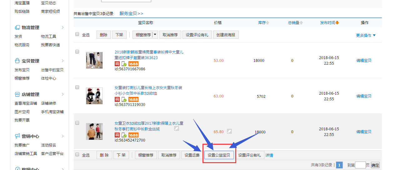 在賣家中心--出售中的寶貝--拉到最底端,勾選設(shè)置公益寶貝。