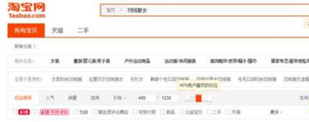 通過淘寶前臺(tái)搜索及圖5,可以很明顯的看到羽絨服的消費(fèi)者主要選擇的價(jià)格階段,絕大部分購買羽絨服的消費(fèi)者選擇了460/1230的價(jià)格階段,亦有36%的消費(fèi)者選擇了169-460的價(jià)格段,通過消費(fèi)者選擇的價(jià)格階段,來反推自己的產(chǎn)品定價(jià),及產(chǎn)品價(jià)格成本。這就很容易對(duì)自己所選的產(chǎn)品價(jià)格進(jìn)行定位了。