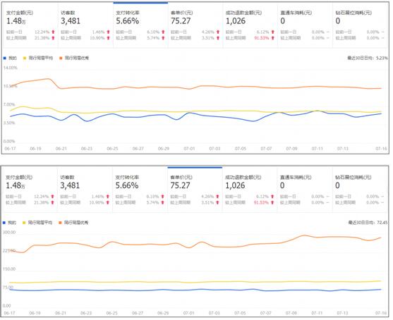 一般我們?cè)诶斫廪D(zhuǎn)化率這個(gè)指標(biāo)的時(shí)候,必須綜合考慮客單價(jià)的問(wèn)題,在常規(guī)的理解中,如果商品的價(jià)格比較高,那么支付轉(zhuǎn)化率肯定就會(huì)低一些。在手淘首頁(yè)大概第二屏的位置,我們可以看到跟行業(yè)均值相比,本店在客單價(jià)和轉(zhuǎn)化率方面的位置:
