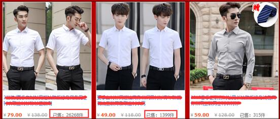 就比如這家,我隨便找的(如果恰好被這家的美工或者運(yùn)營看到,別打我啊,哈哈),除了第一款五分袖和最后一款的條紋襯衫,你告訴我剩下的那些款有多大區(qū)別(當(dāng)然,細(xì)節(jié)上肯定會(huì)有啊)?連模特的姿勢幾乎都一模一樣了!標(biāo)題我沒有截圖出來,也差不多。所以他一個(gè)五皇冠的店鋪,在襯衫類目下,一共72個(gè)在售單品,只有兩個(gè)大爆款,其他的都是默默無聞的在那里放著。就是下面這兩款: