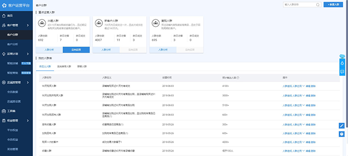 那么我們就可以利用客戶運營平臺的客戶分群來進行一段時間的監(jiān)控,可以記錄一下客戶的使用時間去分析觀察我們的老客戶的使用情況去定期發(fā)優(yōu)惠券給老客戶,比如,掌柜賣的是紙尿褲,那就可以從客戶收貨的那一天開始單獨把這些客戶添加到客戶分群里面進行觀察,一包紙尿褲的使用時間一般大概是半個月左右的樣子吧,那么在客戶差不多把紙尿褲用完的時候,我們就可以發(fā)一些店鋪做的一些活動優(yōu)惠情況發(fā)給老客戶,如果產(chǎn)品給客戶的一個使用情況很好,還發(fā)老客戶專享活動優(yōu)惠的前提下下單的概率我想一般都是比較高的,因為大多數(shù)客戶都比較喜歡占小便宜嘛,只要你的產(chǎn)品給客戶的體驗夠好客戶有這樣的一個需求,恐怕想不購買都不行吧。
