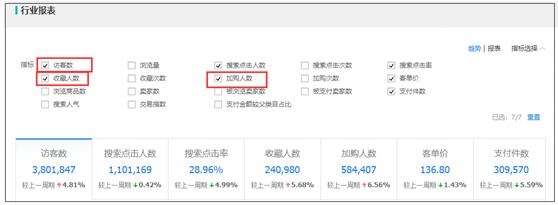 這里面有訪客數(shù)、收藏人數(shù)、加購(gòu)人數(shù),你可以計(jì)算一個(gè)大概:收藏人數(shù)/訪客數(shù)=收藏占比,加購(gòu)人數(shù)/訪客數(shù)=加購(gòu)占比。然后如果你想要更多的搜索流量的扶植,讓扶植期更長(zhǎng),這兩個(gè)指標(biāo)你不能比行業(yè)均值低吧。當(dāng)然,根本是你產(chǎn)品本身的吸引力,除此之外,是不是可以搞一些活動(dòng)鼓勵(lì)收藏和加購(gòu)呢?