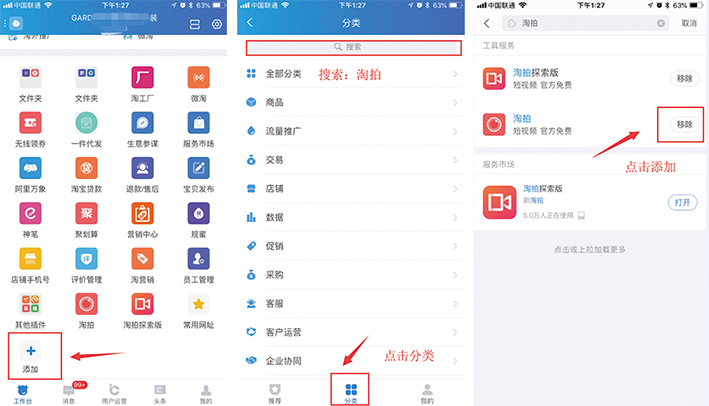 首先我們來看下淘拍的入口,打開手機(jī)千牛 – 下拉找到添加 – 點(diǎn)擊分類 - 搜索:淘拍,然后添加,如圖2: