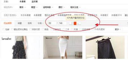 如果我們想給連衣裙搭配的產(chǎn)品是半身裙,就需要再搜索一下半身裙的價(jià)格區(qū)間,在搜索中輸入半身裙,如圖6,我們可以看到在第三個(gè)價(jià)格區(qū)間的半身裙的價(jià)格為62-148,我們?cè)谕扑]關(guān)聯(lián)銷售的時(shí)候就可以選擇這一價(jià)格區(qū)間的產(chǎn)品。