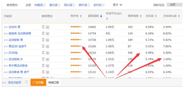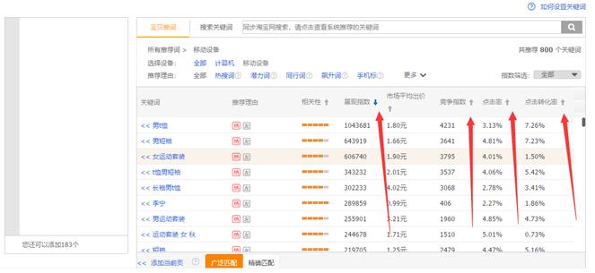 首先點(diǎn)擊直通車?yán)锩娴奶砑雨P(guān)鍵詞,會出現(xiàn)上面的圖片,這個時候我們需要點(diǎn)擊展現(xiàn)指數(shù),讓推薦的關(guān)鍵詞展現(xiàn)指數(shù)由高到低展示,這是為了方便我們選擇關(guān)鍵詞,因?yàn)椴煌闆r下的直通車對關(guān)鍵詞展現(xiàn)指數(shù)的選擇標(biāo)準(zhǔn)是不同的,在直通車初期就要選擇1萬左右的詞,而在直通車帶動自然搜索的時候,預(yù)算充足和選擇的關(guān)鍵詞精準(zhǔn)的情況下,展現(xiàn)指數(shù)肯定是越高越好。這里插一句話,質(zhì)量分是直通車的核心,我這里有一個直通車三天十分的技巧,需要的可以加我旺旺,北蔡說,回復(fù),質(zhì)量分,送你。所以這樣排序更方便我們選定展現(xiàn)指數(shù)區(qū)間,找好自己的區(qū)間之后剩下的選詞標(biāo)準(zhǔn)就是先判斷這個詞是不是適合我們,然后再看點(diǎn)擊率和轉(zhuǎn)化率怎么樣,在直通車漲分期更多的是看點(diǎn)擊率,而直通車帶動自然搜索的時候再看點(diǎn)擊率的同時看一下轉(zhuǎn)化率了,具體的標(biāo)準(zhǔn)一般點(diǎn)擊率超過3都是可以的,而轉(zhuǎn)化率超過1就可以了。最后才是看相關(guān)性,滿格的直接用就可以了,不滿格的可以記錄一下然后在創(chuàng)意標(biāo)題里面加上。
