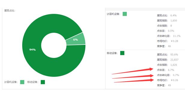 在這個關(guān)鍵詞數(shù)據(jù)透視里面可以看到每個省份的展現(xiàn)排名和數(shù)量,我們可以利用這些來優(yōu)化我們的地域投放。再往下可以看到這些關(guān)鍵詞的核心數(shù)據(jù)表現(xiàn),比如PC端和手機(jī)端的展現(xiàn)占比、市場出價、點(diǎn)擊率等數(shù)據(jù)。