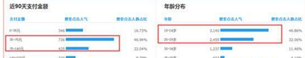 90天的支付金額,可以查看客單價平均保持在什么水平,年齡分布可以準確的推測出我們店鋪的消費人群。有了這些數(shù)據(jù),在經(jīng)過一段時間的分析觀察,人群基本就可以定位準確了。